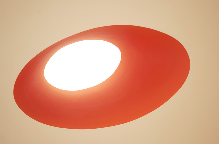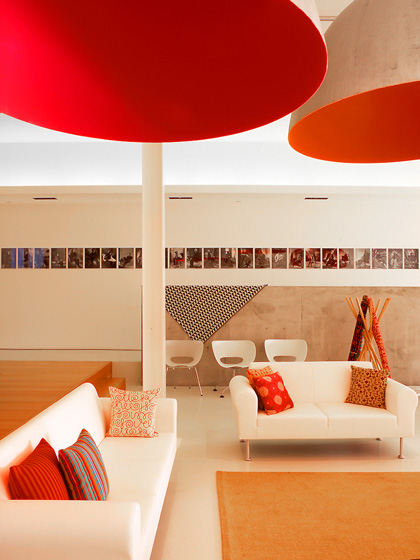 Stripping back the interiors to their original structure, we created two distinct spaces. To maximise the daylight, we transformed what were very randomly punched plastic skylights into vibrantly coloured structured openings with views of the LA sky.